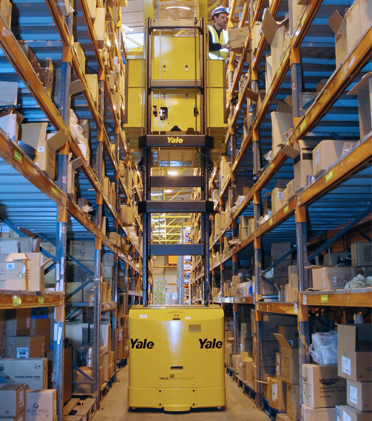 1. Scaffalature porta pallet: sono presenti in tutti i magazzini del mondo. Si distinguono per il fatto che i pallet sono appoggiati sui correnti. Se la scaffalatura è accoppiata, si parla di scaffale bifronte. Nell’immagine qui sotto si nota un operatore che si accinge a prelevare un pallet da uno scaffale porta pallet per mezzo di un MTC, un carrello trilaterale per corsie molto strette.