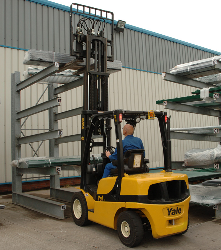3. Scaffalature a mensola, o cantilever: hanno la caratteristica di essere privi del montante anteriore, quindi si tratta di strutture a sbalzo. Sono utilizzati per lo stoccaggio di carichi lunghi: nell’immagine si nota lo stoccaggio di un’unità di carico su un cantilever tramite un carrello GDP30VX diesel.